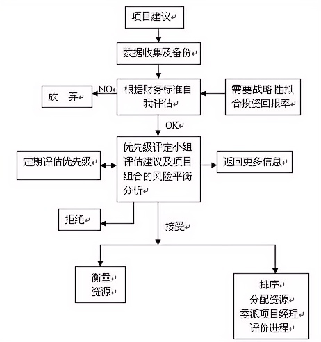 任何组织中都有多于可行方案的项目建议,这种情况特别是在项目驱动的组织里。从众多个建议中挑选那些能使企业价值最大化的项目需要一个结构化的过程(structured process)。下图为排序过程流程图。若发起人基于搜集的数据而认为该项目可行, 就可以把建议递交项目优先级小组。优先级小组根据确定的选择标准和当前的项目组合, 决定拒绝还是接受该项目。如接受, 则使项目开始运作。